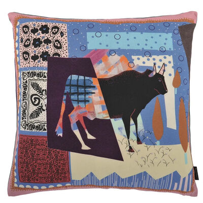 Ce coussin décoratif de Christian Lacroix Maison est une véritable œuvre d'art abstrait. Un taureau graphique en est le point central, entouré d'un collage de motifs. Imprimé numériquement sur coton avec des détails brodés sur le devant.