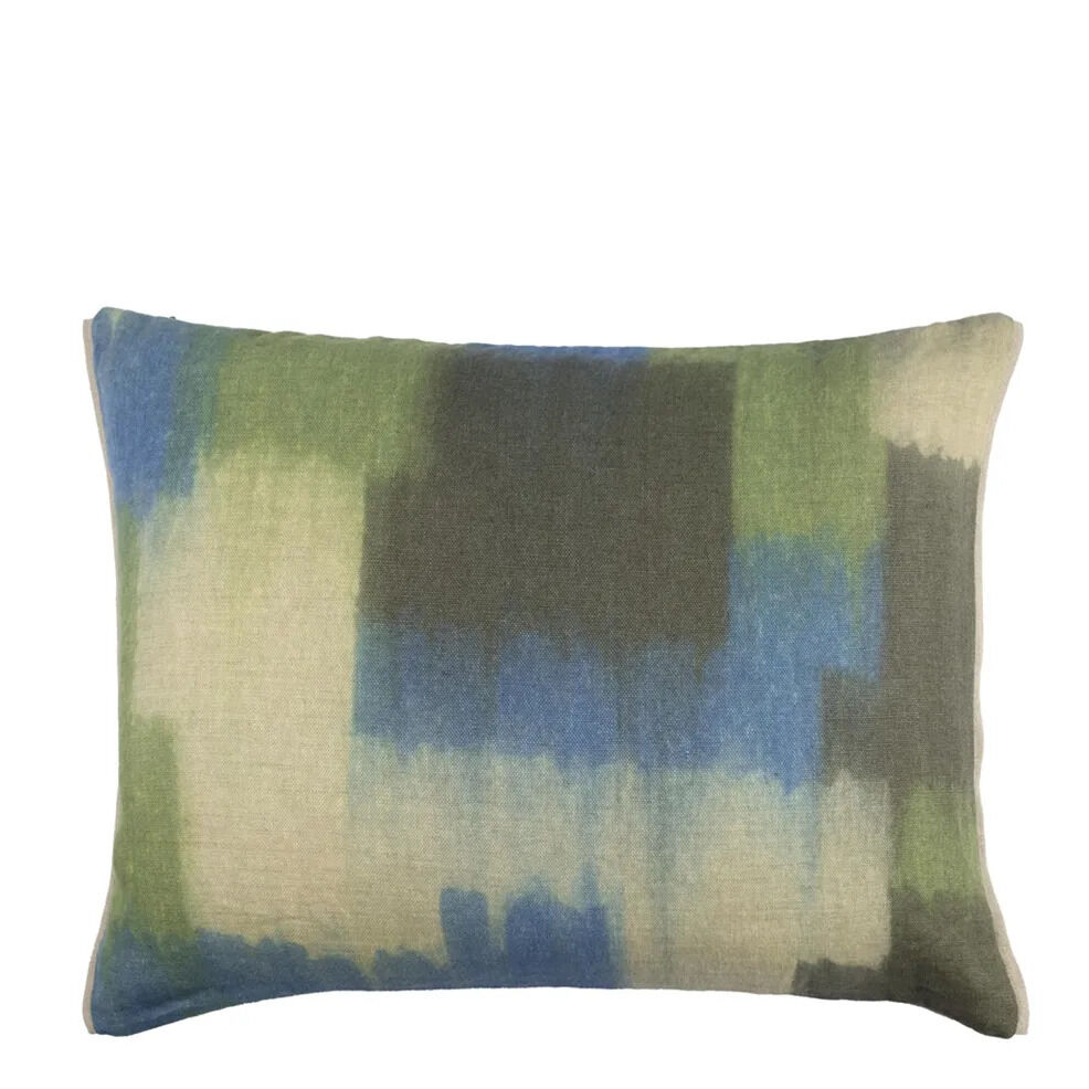 Ce coussin rectangulaire en lin présente des blocs géométriques abstraits imprimés par pulvérisation sur pur lin. Le verso est réalisé en Loiret couleur denim et le coussin est fini par un galon Brera Lino couleur galet. En raison de la technique d’impression spécialisée, le placement du motif varie, créant des pièces uniques qui apportent une touche forte et distinctive à votre intérieur.