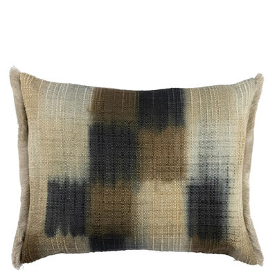 Ce grand coussin rectangulaire saisissant apportera une touche d’élégance à votre intérieur. Un motif abstrait de blocs est imprimé par pulvérisation artistique dans des tons graphiques de charbon et de neutres sur un fond texturé. En raison de la technique d’impression spécialisée, le placement du motif varie, rendant chaque pièce unique. Associé au tissu Melzo couleur ivoire et fini avec une bordure à franges brossées.