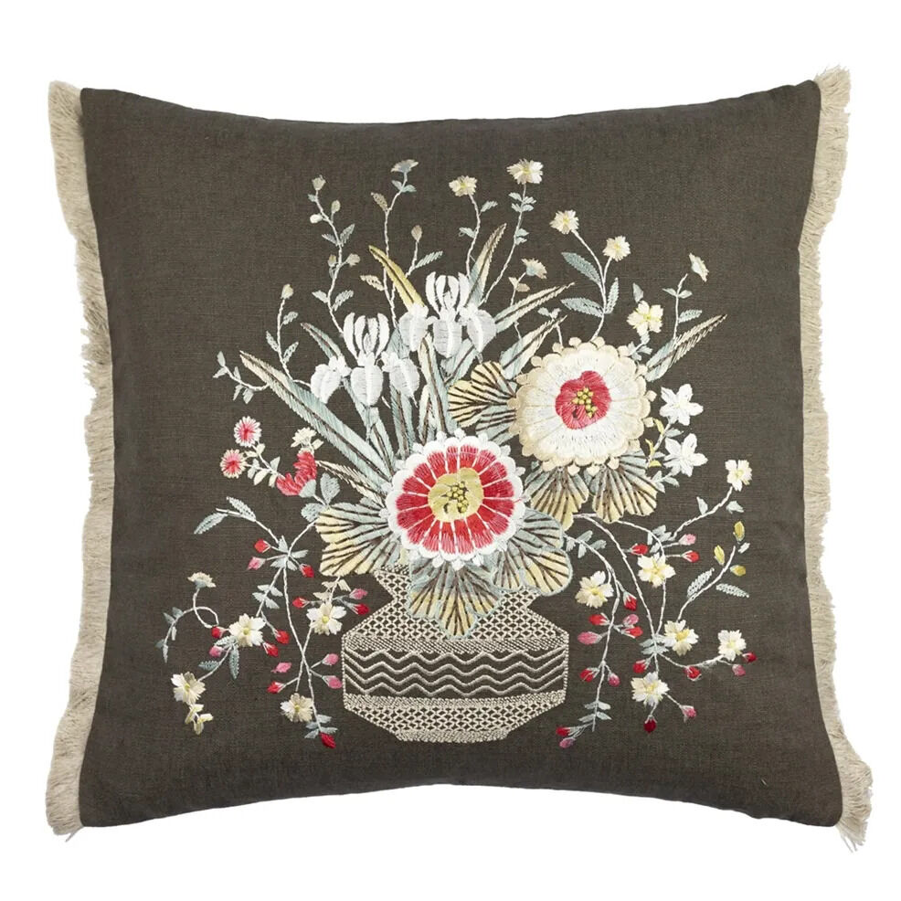 Ce coussin irrésistible deviendra un véritable point focal dans votre intérieur. Il présente un panier floral entièrement brodé, posé sur un riche fond brun foncé, avec un envers en Carlyon String et une finition à franges brossées de couleur naturelle sur deux côtés.