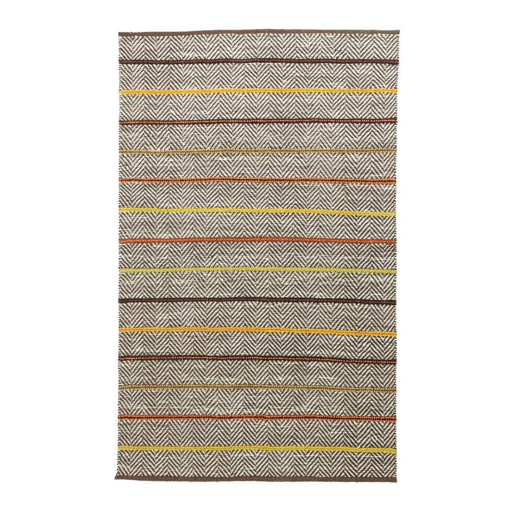 This bold scale striped rug is inspired by our beautiful woven striped fabric. An all-over chevron pattern in natural jute with chocolate wool is elevated with contrasting colourful horizontal bands in copper, ochre and moss chunky wool. This contemporary flat weave floor rug has no additional backing so we advise to use an anti-slip underlay especially if the rug is placed on a smooth surface.