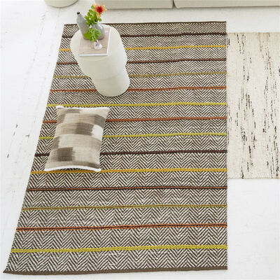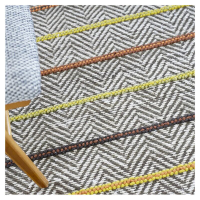 Ce tapis à rayures audacieuses s'inspire de notre magnifique tissu rayé tissé. Son motif à chevrons intégral en jute naturel et laine chocolat est rehaussé par des bandes horizontales colorées contrastantes en laine épaisse cuivrée, ocre et mousse. Ce tapis contemporain à tissage plat ne comporte pas de sous-couche supplémentaire. Nous vous recommandons donc d’utiliser un sous-tapis antidérapant,en particulier lorsqu’il est placé sur une surface lisse.
