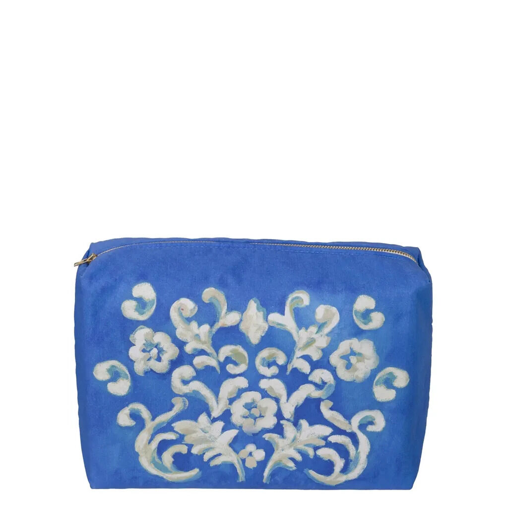 A contemporary large washbag with a painterly damask form set on bright cobalt ground. Digitally printed onto a water-resistant cotton with a waterproof lining. Zip opening with a contrasting colour binding detail.